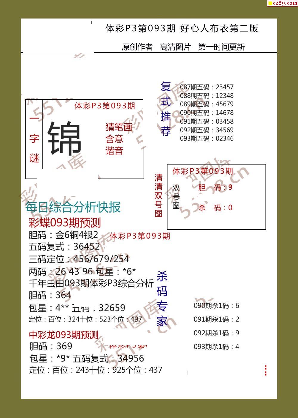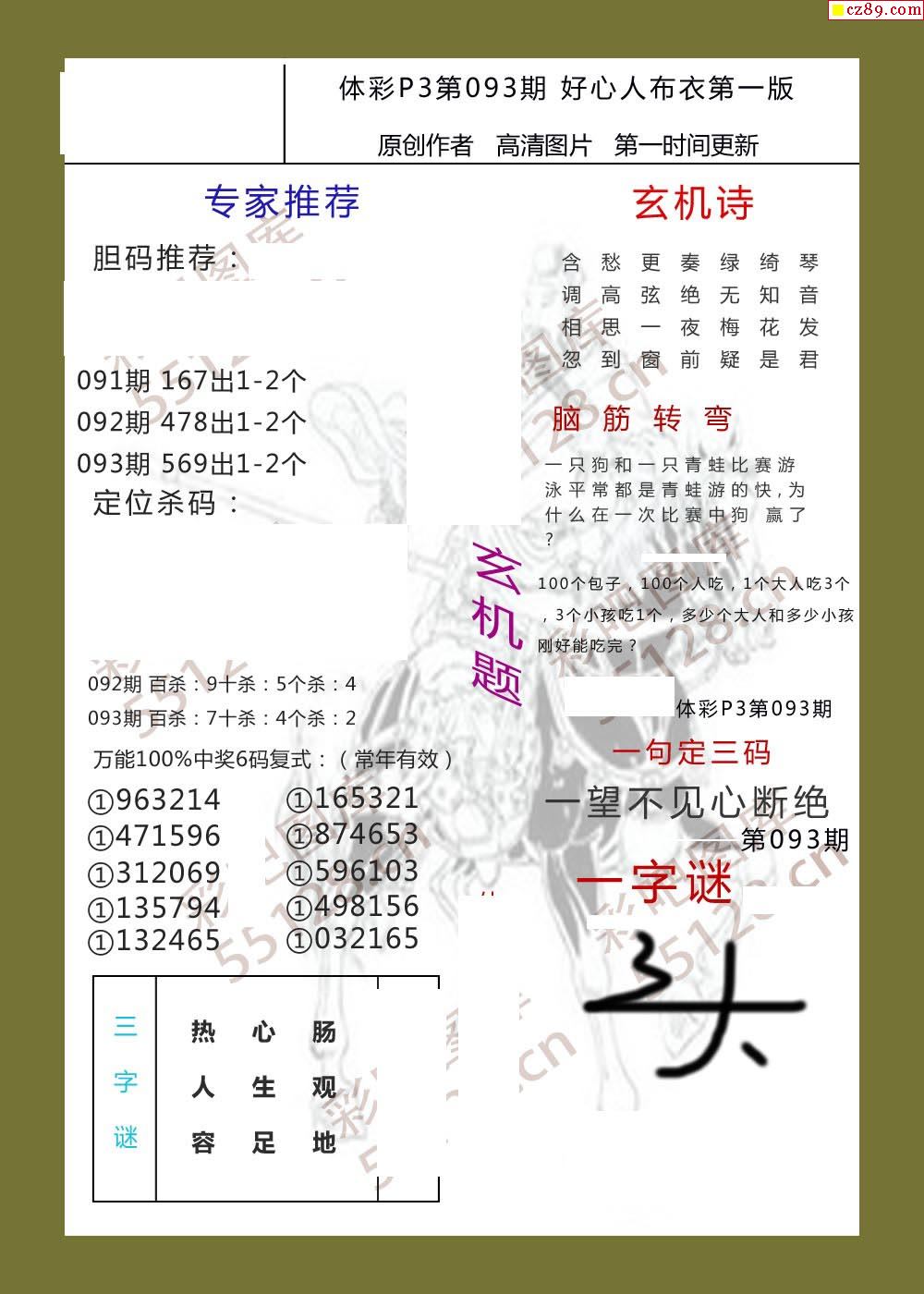 好心人布衣AB版093期体彩p3图谜